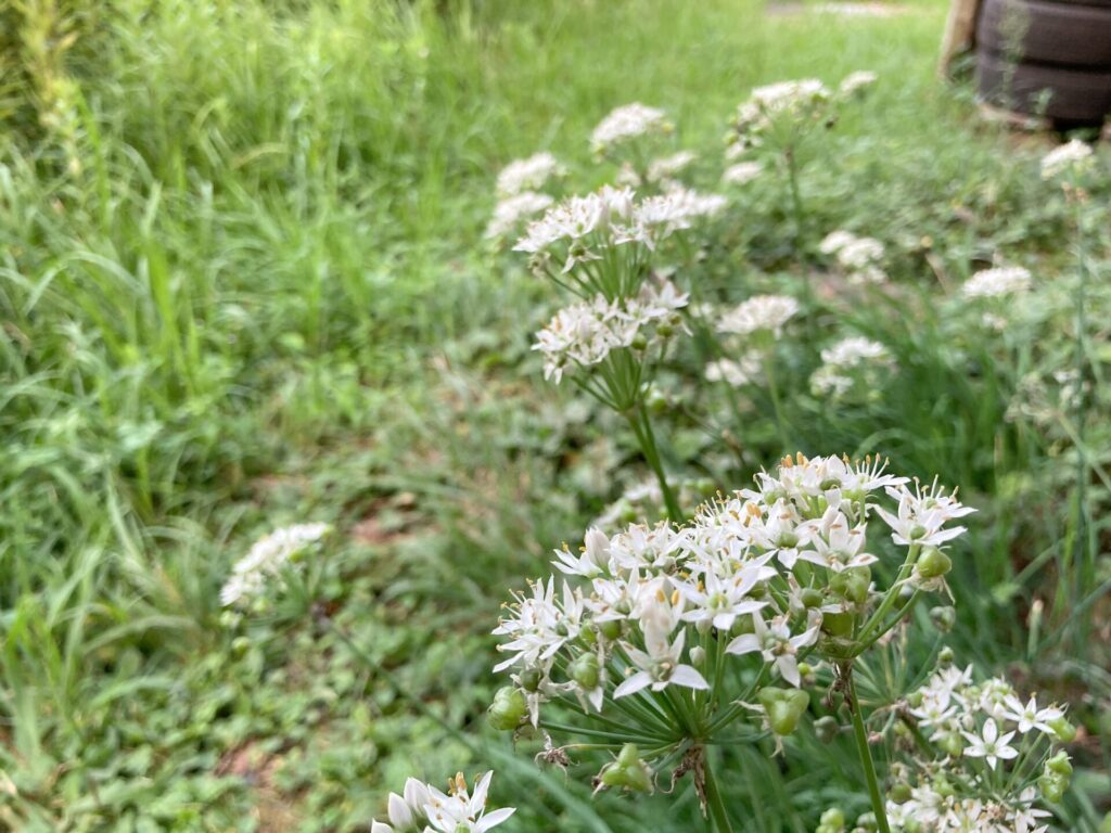 実家が建つ前は、そこは父方の祖母が畑をしていた土地で、その後、うちの実家が建ったわけですが、その名残りの畑のニラが、まだ根付いていて、今年も力強く花を咲かせています。