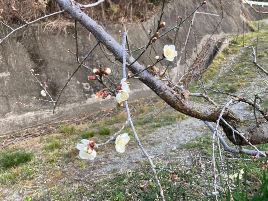 ようやく真冬らしい気候になりましたが、年末まで暖かい日が続いていたからか、梅の花の開花が始まりました。