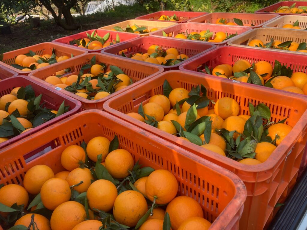 畑へ入るとネーブルオレンジの香りが漂っています。ネーブルは完熟するまで木にならせておくと、特有のあま〜い芳香を放ってきます。寒い地域では凍害の心配があるので、この時期までならせておくことは厳しいのですが、和歌山県沿岸部は温暖な気候のため、袋がけなどの対策は必要ですが、樹上完熟させることができます。